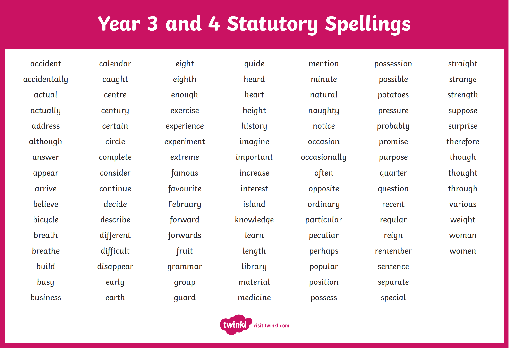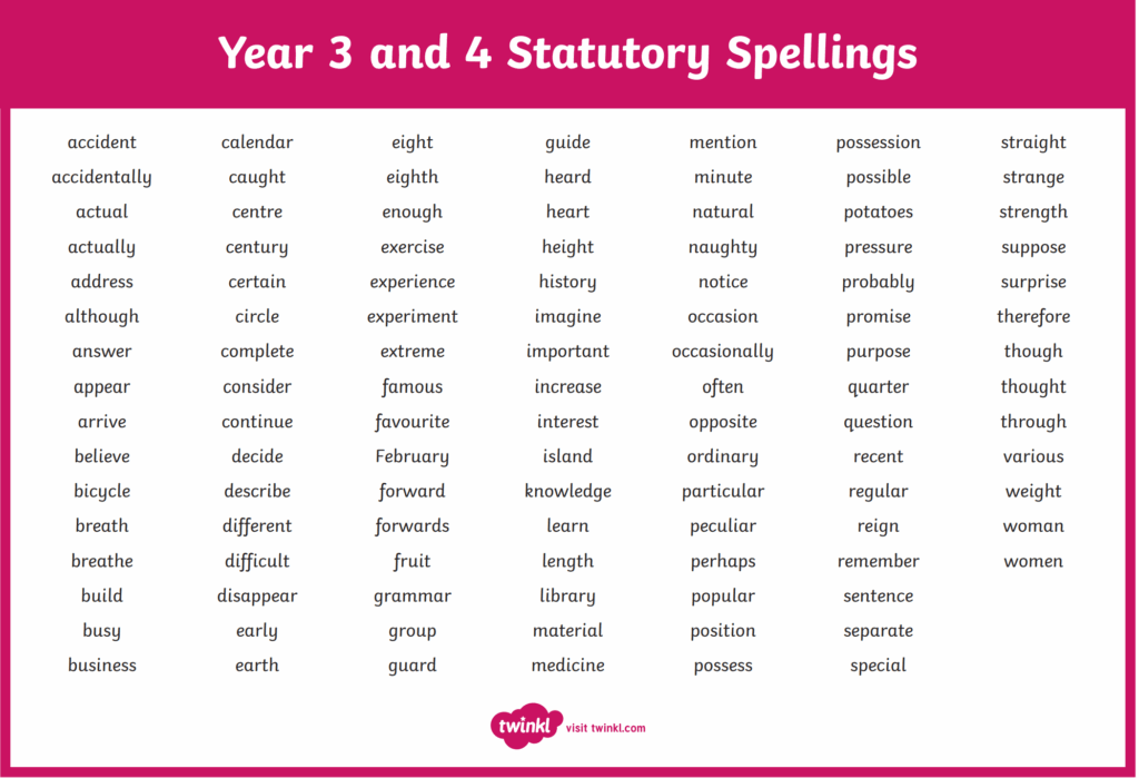 Below is a list of the statutory words for Year 3 and 4 that the children need to be able to read and spell by the end of Year 4.